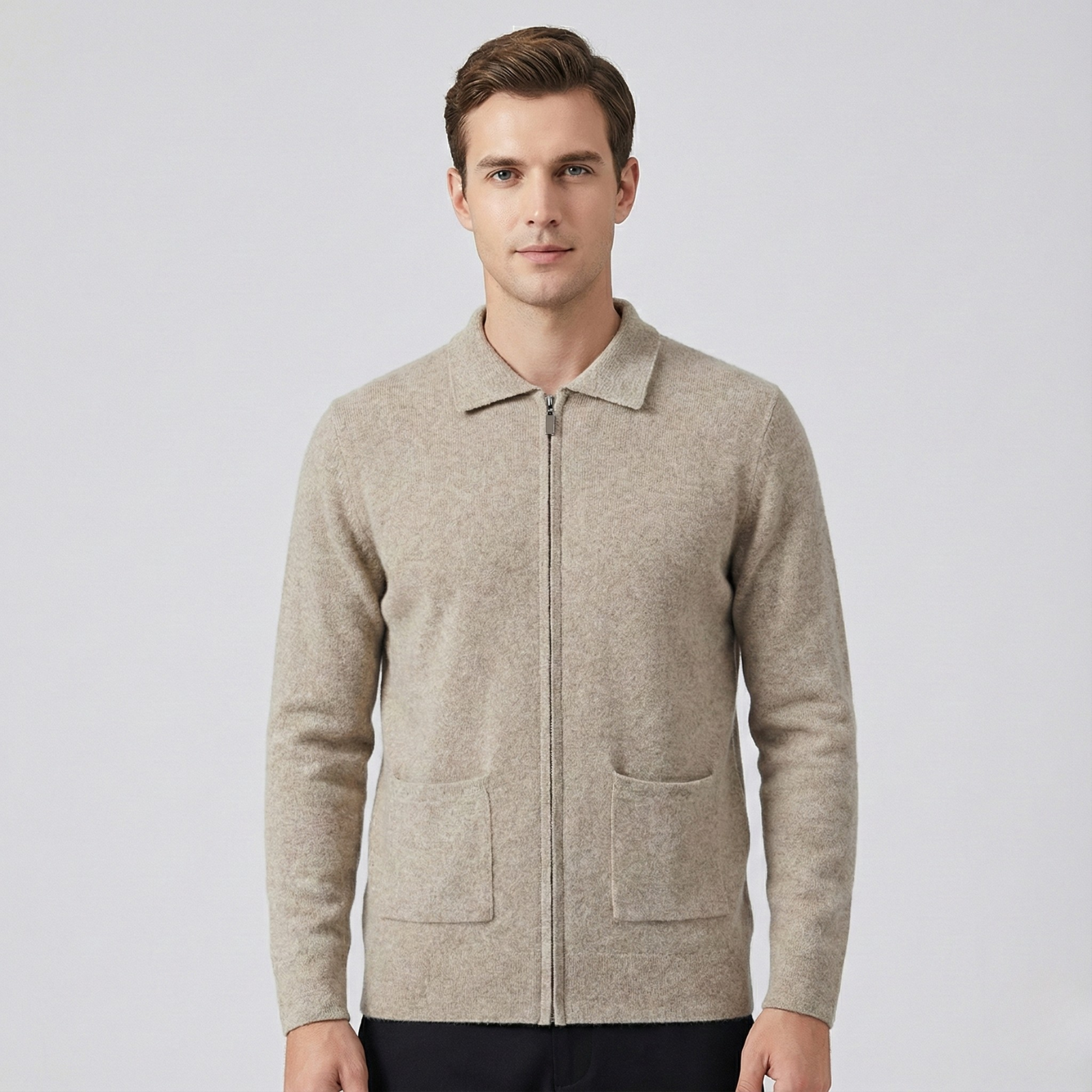 A refined and luxurious cardigan crafted from premium cashmere for unparalleled softness and comfort. The full-zip design provides versatility and ease of wear, making it perfect for layering over casual or smart outfits. Combining timeless elegance with modern functionality, the Premium Cashmere Zipper Cardigan elevates everyday style into a polished and sophisticated statement piece.